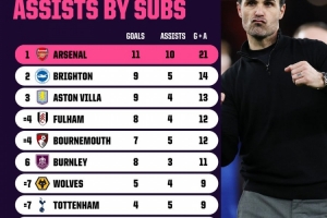本赛季英超替补参与进球榜:阿森纳11球10助攻第1,曼联并列第9