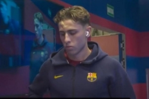 替补待命!巴萨中场费尔明额头上贴着创可贴,而且有明显肿块