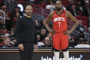 火箭球迷:范弗里特?问题比那严重多了。想象一下,在整整一节的时间里,除了杜兰特单打之外,根本组织不起任何其他的进攻战术。乌度卡在进攻端简直一窍不通。