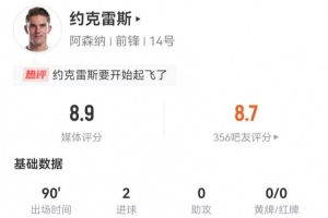体育资讯2月23日讯 阿森纳在本轮英超对阵热刺,约克雷斯本场数据如下:
