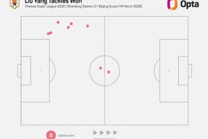 8 - 刘洋本场比赛有8次成功抢断,刷新自2012年Opta采集相关数据以来,山东泰山球员单场中超新高。