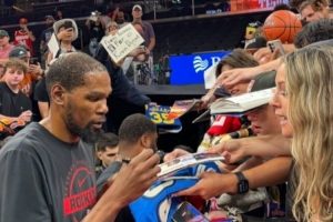 在赛前训练结束后,杜兰特为菲尼克斯的球迷们签名。