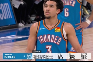 雷霆客场挑战活塞,转播方晒出麦凯恩本赛季交易前后的数据对比,得分,投篮命中率和三分命中率均明显提升。