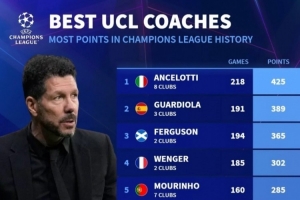 体育资讯4月15日讯 德国转会市场列出了欧冠主帅积分榜,安切洛蒂、瓜迪奥拉、弗格森前三,西蒙尼第六。
