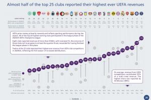 欧足联奖金主要奖励并反映赛季内的竞技表现。前25名最高收入俱乐部均参加了2024/25赛季欧冠联赛阶段比赛。其中8家俱乐部欧战收入超过1亿欧元。利物浦是唯一未进入八强的球队,但因联赛阶段位列头名而获得丰厚回报。25家球队中12家俱乐部在本赛季欧足联俱乐部赛事收入创历史新高,得益于新赛制下分发金额的提升。