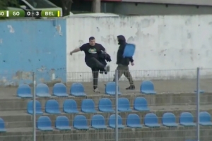 新戈里察目前在斯洛文尼亚第二级别联赛中排名垫底,距离安全区有九分之差。当ND贝尔廷齐的多米尼克·德尔克打入第三球时,一名新戈里察球迷一脚将看台座椅踢飞到了空中。