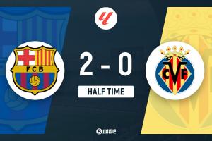 上半场补时3分钟,巴萨2-0比利亚雷亚尔。