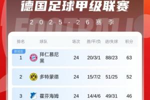 体育资讯03月01日讯 德甲第24轮德国国家德比,拜仁3-2逆转多特,现11分领跑积分榜。最新德甲积分榜如下: